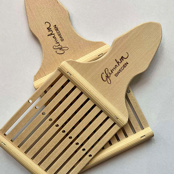 Elegant og let spjældvæv i træ med 10 riller, designet med et praktisk håndtag for en mere effektiv og behagelig væveoplevelse. Spjældvæven fungerer som en rammevæv, men består udelukkende af kammen.